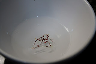 So, to make the saffron rice, I started by soaking a few strands of saffron in hot water for about 15 minutes.